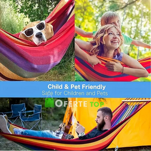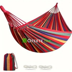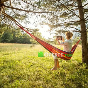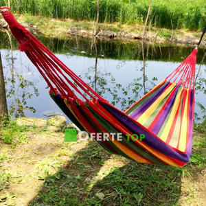 Visul unei relaxari reusite este un hamac prins de doi pomi bogati intr-o padure racoroasa si linistita, cu un pahar de limonada in mana! Sau poate chiar in curtea dumneavoastra, intr-o dupa amiaza placuta de vara, cand v-ati retras pentru niste momente din stresul cotidian! Astfel, acest hamac nu trebuie sa va lipseasca!!