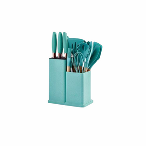 Set bucatarie de 12 ustensile de din silicon termorezistent si maner din lemn natural