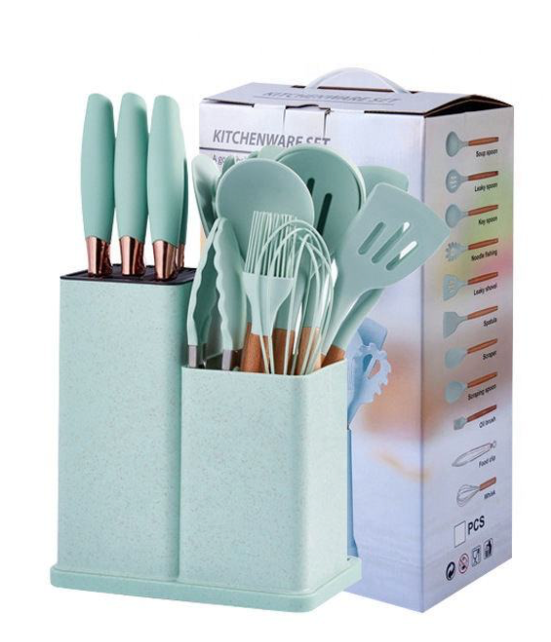 Este compus din 12 ustensile confectionate din silicon antiaderent, care protejeaza impotriva zgarieturilor celelalte vase de gatit si un suport practic, pentru a le avea la indemana mereu.
